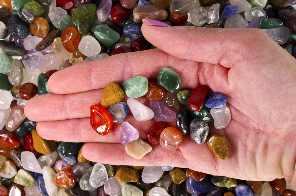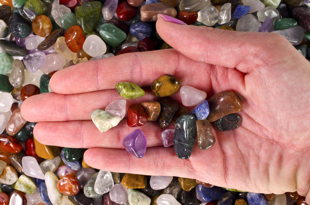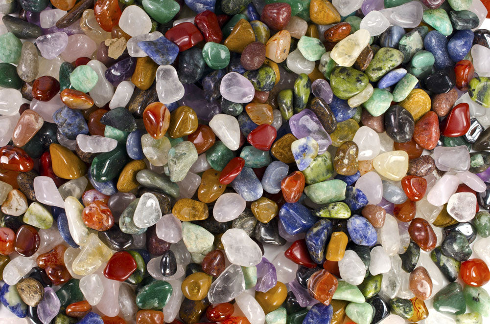 In most cases you will receive at least 15 different stone types which could include: Agate, Amazonite, Amethyst, Aquamarine, Black Onyx, Black Tourmaline, Blue Quartz, Bronzite, Carnelian, Citrine, Crystal with Sulpher, Dalmatian Jasper, Dendritic Agate, Dolomite, Emerald, Feldspar, Hematoid Quartz, Garnet, Green Aventurine, Green Jasper, Hematite, Jade, Milky Quartz, Nephrite Jade, Orange Calcite, Crystal Quartz, Red Aventurine, Red Jasper, Rose Quartz, Smokey Quartz, Sodalite, Tiger Eye, Unakite and more!