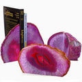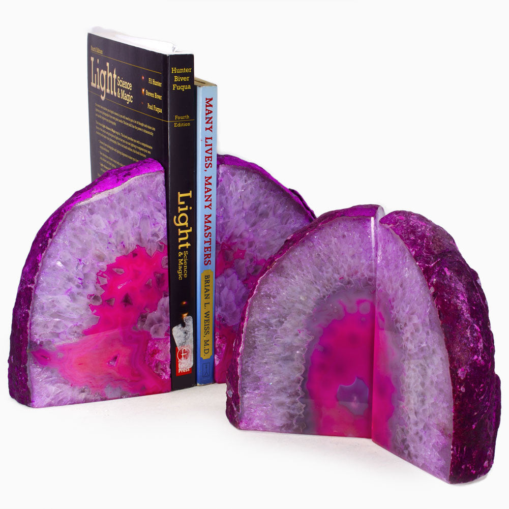 The Fantasia® brand of Pink Agate Bookends start with hand selected pieces of premium agate which are graded for superior quality. After each piece is checked to make sure they meet Fantasia's® strict quality standards they are hand cut, dyed to add the pink color, and the faces are polished by master craftsmen to provide a spectacular visual appearance while also being functional to hold books in place. With your order you will receive a single pair of these remarkable bookends. Since each piece of Agate is completely natural we want our customers to be aware that no two pairs of bookends are exactly alike, and the pair of bookends you receive will be unique but similar to those shown in our images. You may notice different patterns in the bookends you receive, along with different shades of pinks in each piece which is to be expected when starting with a natural agate that isn't a man made item.