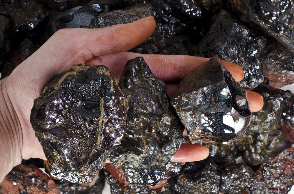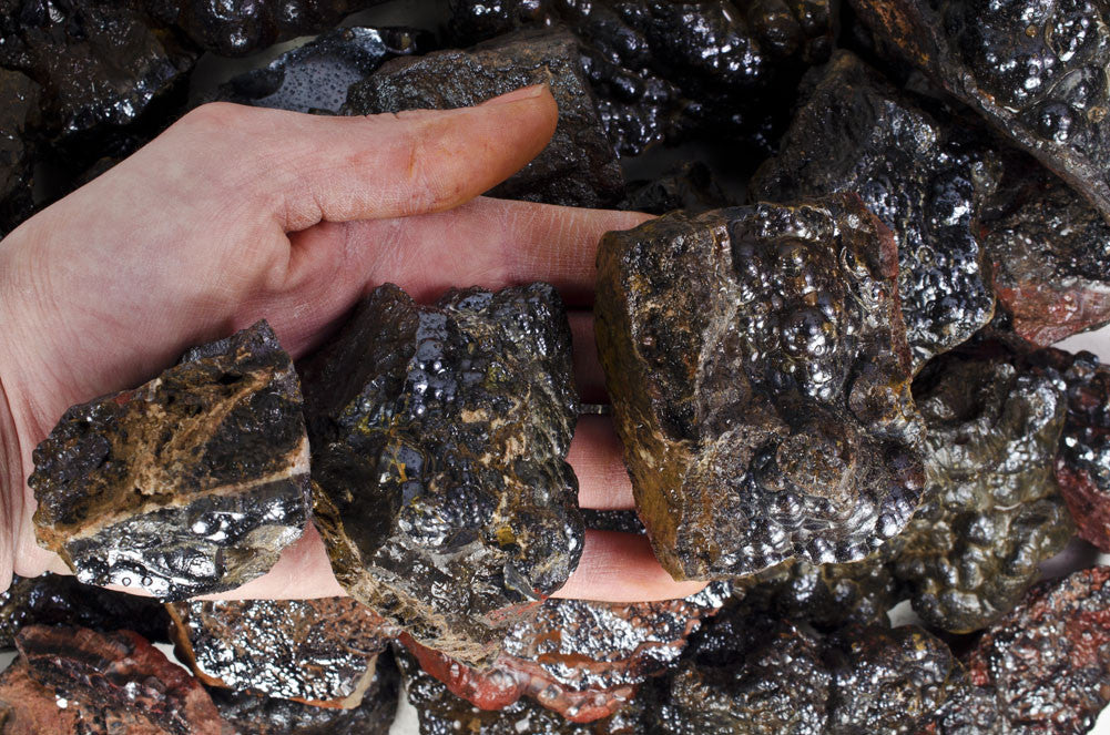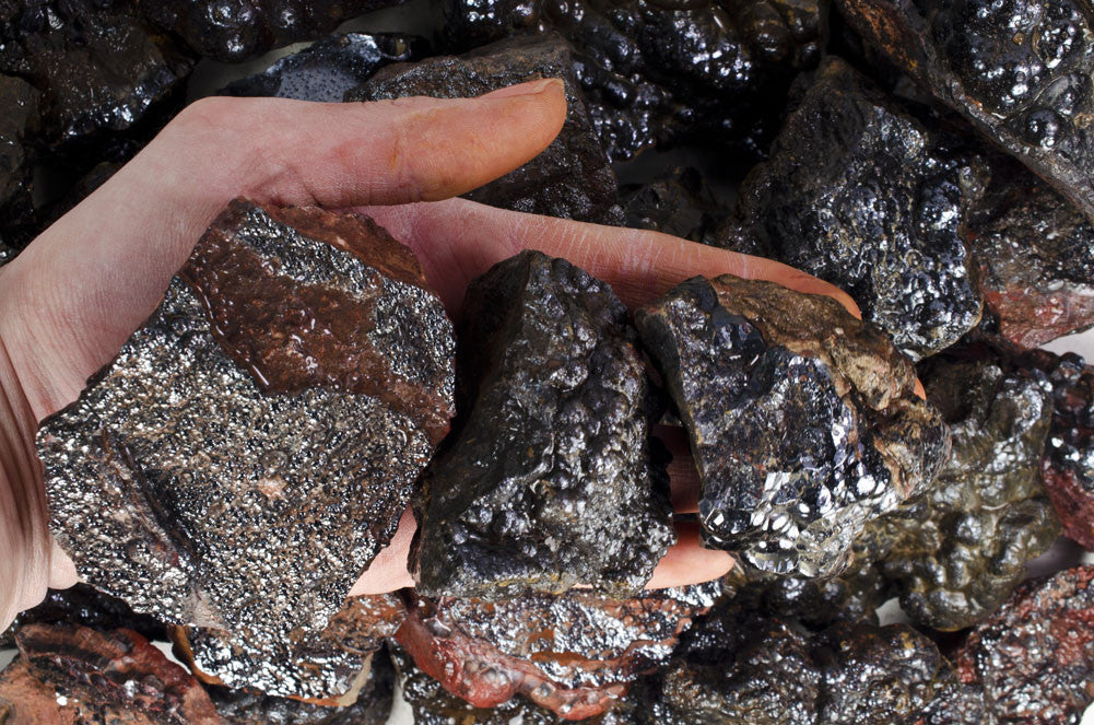 The Fantasia® brand of Hematite Kidney Ore you are ordering is 100% natural and imported by the ton directly from Morocco to Fantasia Mining's USA rock yard. This material has a beautiful natural silver black color and contains natural bubble formations. This material is perfect for tumbling, cabbing, decorations, or keeping in it's natural form as a specimen. Your order will contain multiple pieces of this spectacular material of varying natural sizes, shapes and patterns as shown in the images which is equal to or greater than the weight purchased.